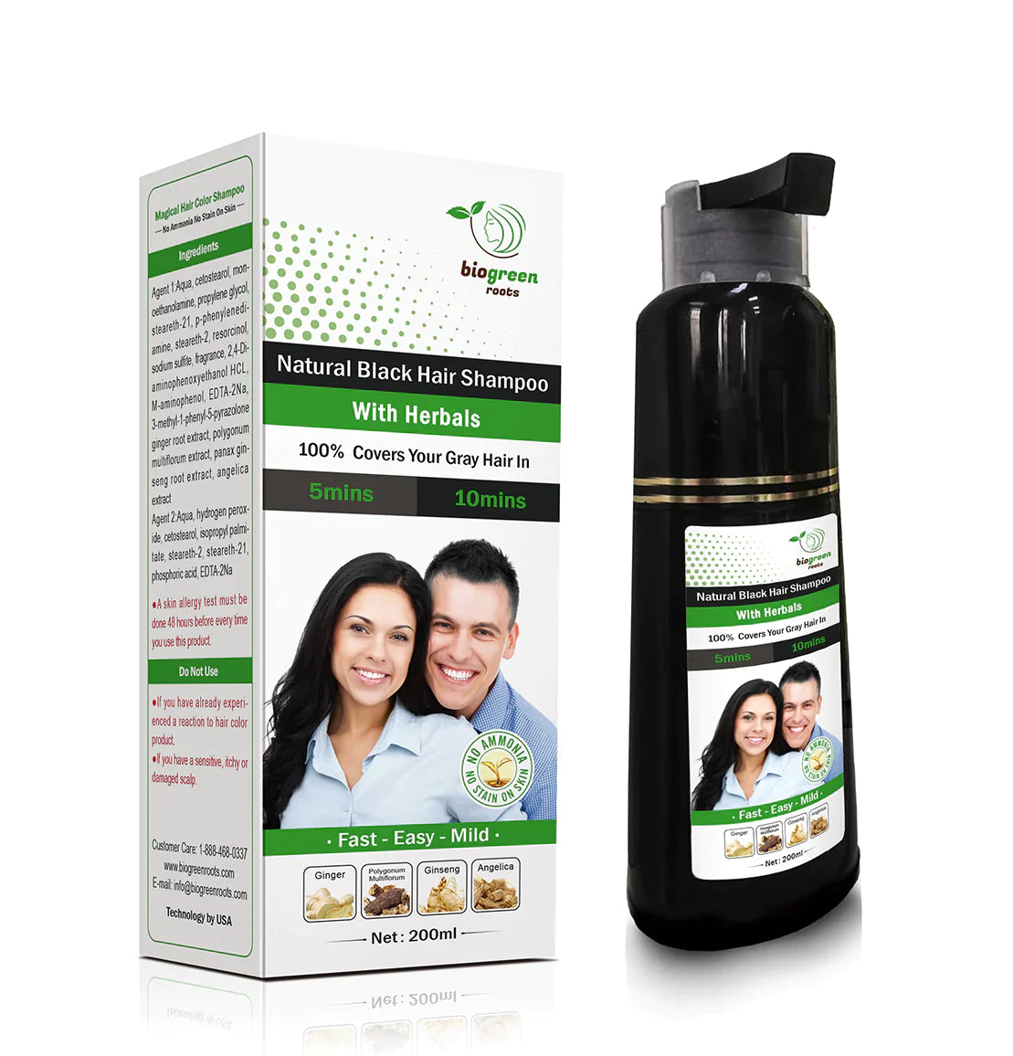 Biogreen Root Natural Black with herbals hair color shampoo is manufactured with pure and real botanical ingredients, minerals and purified water. No use of Ammonia makes it a stain-free natural color shampoo for skin. The natural ingredients used in our hair dye shampoo are ginger, ginseng, polygonum multiforum and angelica. Which gives this color dye shampoo an ability to strengthen, repair, nourish and protect your scalp against dryness and gray hair. This shampoo is not for daily use. Use 3-4 weeks after the last application to cover your gray hair.
