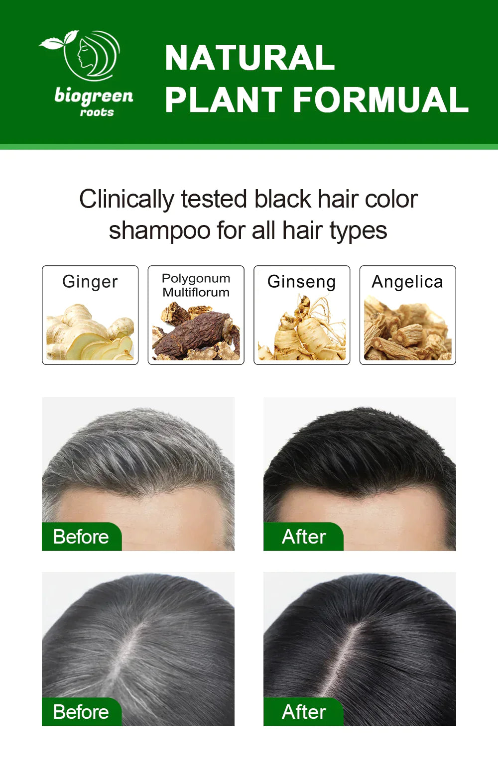 Biogreen Root Natural Black with herbals hair color shampoo is manufactured with pure and real botanical ingredients, minerals and purified water. No use of Ammonia makes it a stain-free natural color shampoo for skin. The natural ingredients used in our hair dye shampoo are ginger, ginseng, polygonum multiforum and angelica. Which gives this color dye shampoo an ability to strengthen, repair, nourish and protect your scalp against dryness and gray hair. This shampoo is not for daily use. Use 3-4 weeks after the last application to cover your gray hair.