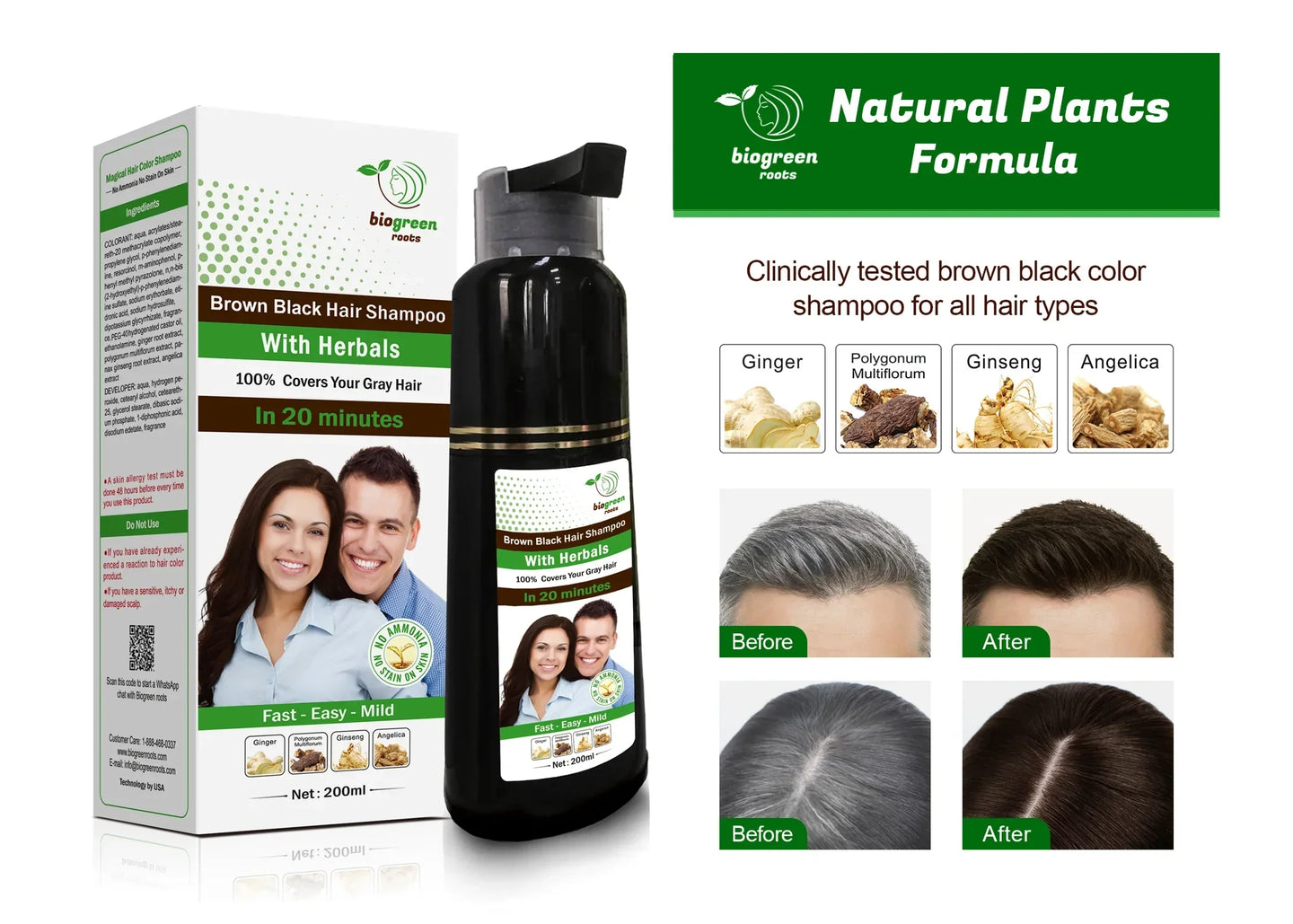 Biogreen Root Brown Black with herbals hair color shampoo is manufactured with pure and real botanical ingredients, minerals and purified water. No use of Ammonia makes it a stain-free natural color shampoo for skin. The natural ingredients used in our hair dye shampoo are ginger, ginseng, polygonum multiforum and angelica. Which gives this color dye shampoo an ability to strengthen, repair, nourish and protect your scalp against dryness and gray hair. This shampoo is not for daily use. Use 3-4 weeks after the last application to cover your gray hair.