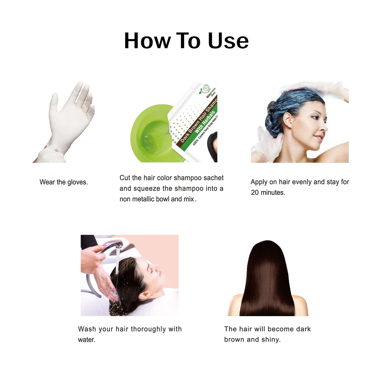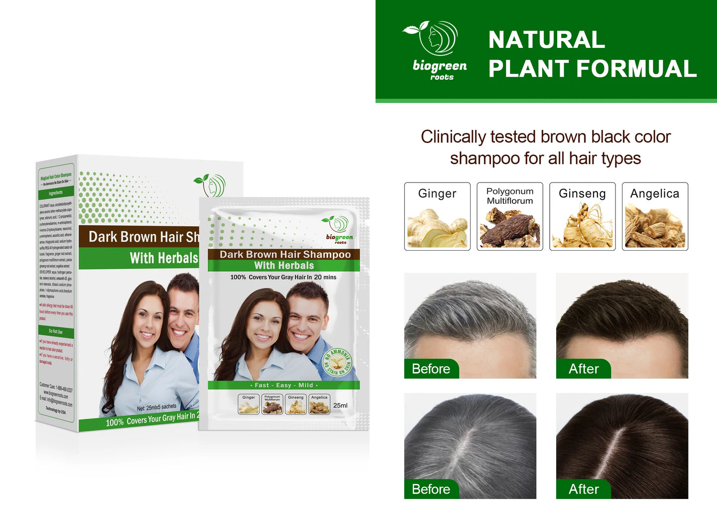 Biogreen Roots Dark Brown Hair Shampoo with herbals hair color shampoo is manufactured with pure and real botanical ingredients, minerals and purified water. No use of Ammonia makes it a stain-free natural color shampoo for skin. You don’t need to wet your hair. Just apply on dry hair.The natural ingredients used in our hair dye shampoo are ginger, ginseng, polygonum multiforum and angelica. Which gives this color dye shampoo an ability to strengthen, repair, nourish and protect your scalp against dryness and gray hair. This shampoo is not for daily use. Use 3-4 weeks after the last application to cover your gray hair.