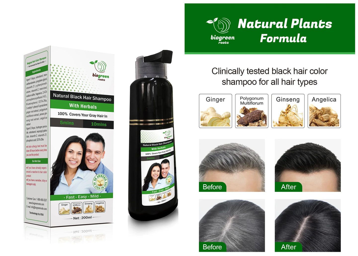 ਬਾਇਓਗਰੀਨ ਰੂਟ ਨੈਚੁਰਲ ਬਲੈਕ ਵਿਦ ਹਰਬਲਸ ਹੇਅਰ ਕਲਰ ਸ਼ੈਂਪੂ ਸ਼ੁੱਧ ਅਤੇ ਅਸਲੀ ਬੋਟੈਨੀਕਲ ਸਮੱਗਰੀ, ਖਣਿਜ ਅਤੇ ਸ਼ੁੱਧ ਪਾਣੀ ਨਾਲ ਤਿਆਰ ਕੀਤਾ ਗਿਆ ਹੈ। ਅਮੋਨੀਆ ਦੀ ਕੋਈ ਵਰਤੋਂ ਇਸ ਨੂੰ ਚਮੜੀ ਲਈ ਦਾਗ-ਮੁਕਤ ਕੁਦਰਤੀ ਰੰਗ ਦਾ ਸ਼ੈਂਪੂ ਬਣਾਉਂਦੀ ਹੈ। ਸਾਡੇ ਹੇਅਰ ਡਾਈ ਸ਼ੈਂਪੂ ਵਿੱਚ ਵਰਤੀਆਂ ਜਾਣ ਵਾਲੀਆਂ ਕੁਦਰਤੀ ਸਮੱਗਰੀਆਂ ਹਨ ਅਦਰਕ, ਜਿਨਸੇਂਗ, ਪੌਲੀਗੋਨਮ ਮਲਟੀਫੋਰਮ ਅਤੇ ਐਂਜਲਿਕਾ। ਜੋ ਇਸ ਕਲਰ ਡਾਈ ਸ਼ੈਂਪੂ ਨੂੰ ਤੁਹਾਡੀ ਖੋਪੜੀ ਨੂੰ ਖੁਸ਼ਕੀ ਅਤੇ ਸਲੇਟੀ ਵਾਲਾਂ ਤੋਂ ਮਜ਼ਬੂਤ, ਮੁਰੰਮਤ, ਪੋਸ਼ਣ ਅਤੇ ਸੁਰੱਖਿਆ ਦੇਣ ਦੀ ਸਮਰੱਥਾ ਦਿੰਦਾ ਹੈ। ਇਹ ਸ਼ੈਂਪੂ ਰੋਜ਼ਾਨਾ ਵਰਤੋਂ ਲਈ ਨਹੀਂ ਹੈ। ਆਪਣੇ ਸਲੇਟੀ ਵਾਲਾਂ ਨੂੰ ਢੱਕਣ ਲਈ ਆਖਰੀ ਐਪਲੀਕੇਸ਼ਨ ਤੋਂ 3-4 ਹਫ਼ਤਿਆਂ ਬਾਅਦ ਵਰਤੋ।