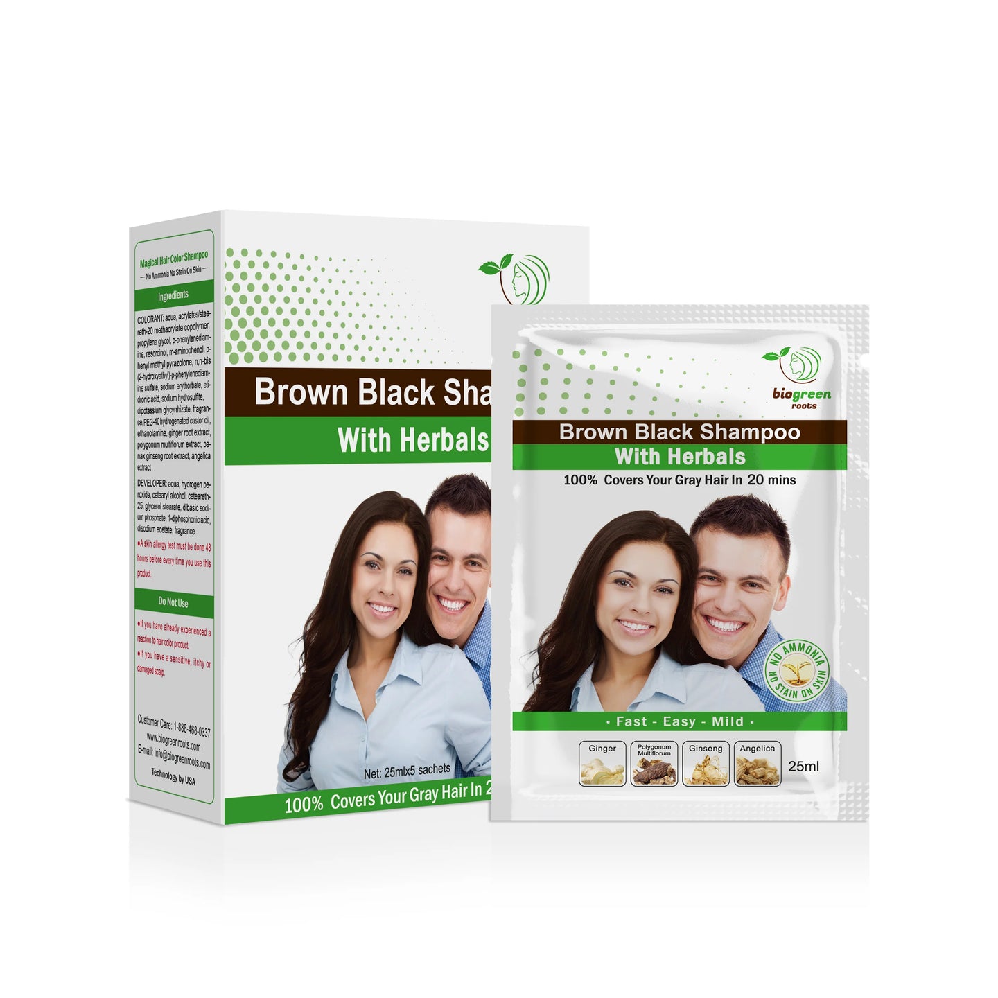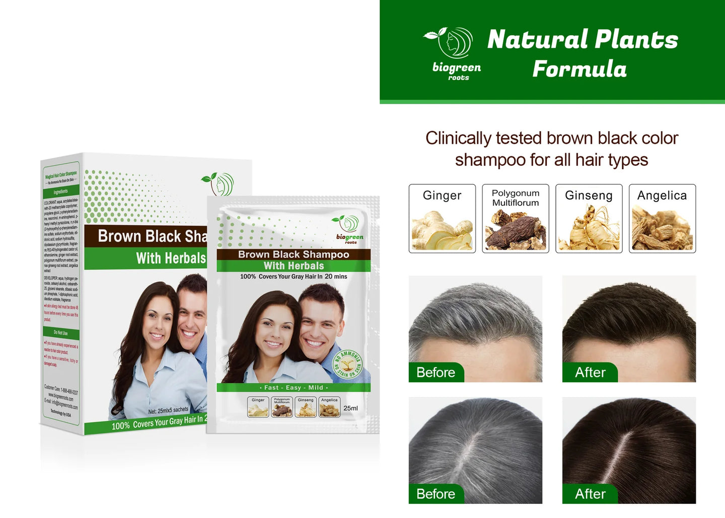 ਬਾਇਓਗਰੀਨ ਰੂਟਸ ਬਰਾਊਨ ਬਲੈਕ ਹੇਅਰ ਸ਼ੈਂਪੂ ਹਰਬਲਸ ਵਾਲ ਕਲਰ ਸ਼ੈਂਪੂ ਦੇ ਨਾਲ ਸ਼ੁੱਧ ਅਤੇ ਅਸਲੀ ਬੋਟੈਨੀਕਲ ਸਮੱਗਰੀ, ਖਣਿਜ ਅਤੇ ਸ਼ੁੱਧ ਪਾਣੀ ਨਾਲ ਤਿਆਰ ਕੀਤਾ ਗਿਆ ਹੈ। ਅਮੋਨੀਆ ਦੀ ਕੋਈ ਵਰਤੋਂ ਇਸ ਨੂੰ ਚਮੜੀ ਲਈ ਦਾਗ-ਮੁਕਤ ਕੁਦਰਤੀ ਰੰਗ ਦਾ ਸ਼ੈਂਪੂ ਬਣਾਉਂਦੀ ਹੈ। ਤੁਹਾਨੂੰ ਆਪਣੇ ਵਾਲ ਗਿੱਲੇ ਕਰਨ ਦੀ ਲੋੜ ਨਹੀਂ ਹੈ। ਸਿਰਫ਼ ਸੁੱਕੇ ਵਾਲਾਂ 'ਤੇ ਲਾਗੂ ਕਰੋ। ਸਾਡੇ ਵਾਲਾਂ ਨੂੰ ਰੰਗਣ ਵਾਲੇ ਸ਼ੈਂਪੂ ਵਿੱਚ ਵਰਤੀਆਂ ਜਾਣ ਵਾਲੀਆਂ ਕੁਦਰਤੀ ਸਮੱਗਰੀਆਂ ਹਨ ਅਦਰਕ, ਜਿਨਸੇਂਗ, ਪੌਲੀਗੋਨਮ ਮਲਟੀਫੋਰਮ ਅਤੇ ਐਂਜਲਿਕਾ। ਜੋ ਇਸ ਕਲਰ ਡਾਈ ਸ਼ੈਂਪੂ ਨੂੰ ਤੁਹਾਡੀ ਖੋਪੜੀ ਨੂੰ ਖੁਸ਼ਕੀ ਅਤੇ ਸਲੇਟੀ ਵਾਲਾਂ ਤੋਂ ਮਜ਼ਬੂਤ, ਮੁਰੰਮਤ, ਪੋਸ਼ਣ ਅਤੇ ਸੁਰੱਖਿਆ ਦੇਣ ਦੀ ਸਮਰੱਥਾ ਦਿੰਦਾ ਹੈ। ਇਹ ਸ਼ੈਂਪੂ ਰੋਜ਼ਾਨਾ ਵਰਤੋਂ ਲਈ ਨਹੀਂ ਹੈ। ਆਪਣੇ ਸਲੇਟੀ ਵਾਲਾਂ ਨੂੰ ਢੱਕਣ ਲਈ ਆਖਰੀ ਐਪਲੀਕੇਸ਼ਨ ਤੋਂ 3-4 ਹਫ਼ਤਿਆਂ ਬਾਅਦ ਵਰਤੋ।