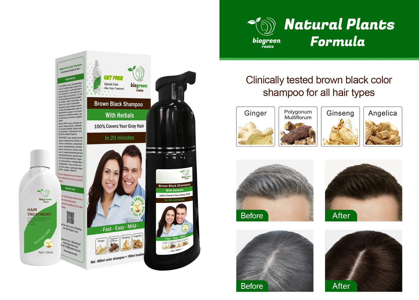 Biogreen Root Brown Black with herbals hair color shampoo is manufactured with pure and real botanical ingredients, minerals and purified water. No use of Ammonia makes it a stain-free natural color shampoo for skin. The natural ingredients used in our hair dye shampoo are ginger, ginseng, polygonum multiforum and angelica. Which gives this color dye shampoo an ability to strengthen, repair, nourish and protect your scalp against dryness and gray hair. This shampoo is not for daily use. Use 3-4 weeks after the last application to cover your gray hair.