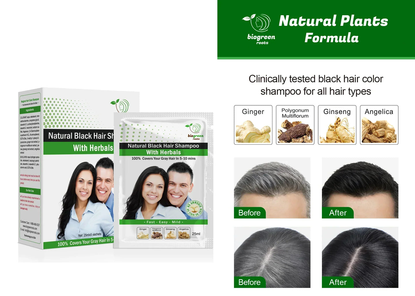 Biogreen Roots Natural Black Hair Shampoo with herbals hair color shampoo is manufactured with pure and real botanical ingredients, minerals and purified water. No use of Ammonia makes it a stain-free natural color shampoo for skin. You don’t need to wet your hair. Just apply on dry hair.The natural ingredients used in our hair dye shampoo are ginger, ginseng, polygonum multiforum and angelica. Which gives this color dye shampoo an ability to strengthen, repair, nourish and protect your scalp against dryness and gray hair. This shampoo is not for daily use. Use 3-4 weeks after the last application to cover your gray hair.