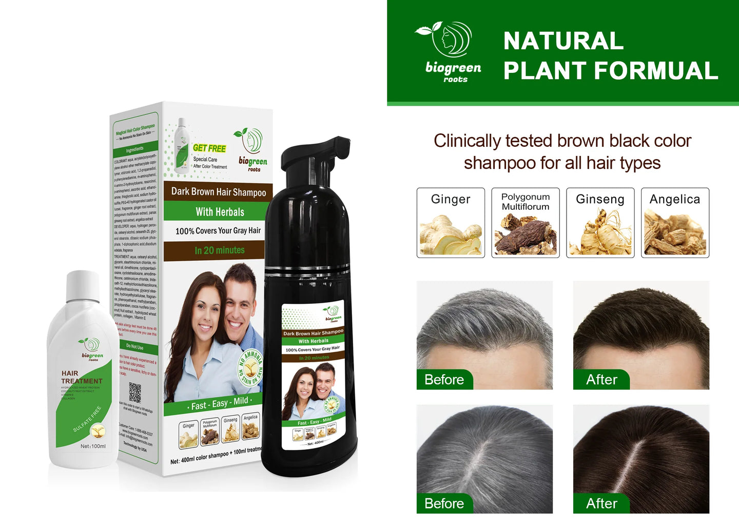Biogreen Root Dark Brown with herbals hair color shampoo is manufactured with pure and real botanical ingredients, minerals and purified water. No use of Ammonia makes it a stain-free natural color shampoo for skin. The natural ingredients used in our hair dye shampoo are ginger, ginseng, polygonum multiforum and angelica. Which gives this color dye shampoo an ability to strengthen, repair, nourish and protect your scalp against dryness and gray hair. This shampoo is not for daily use. Use 3-4 weeks after the last application to cover your gray hair.